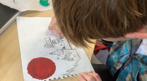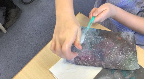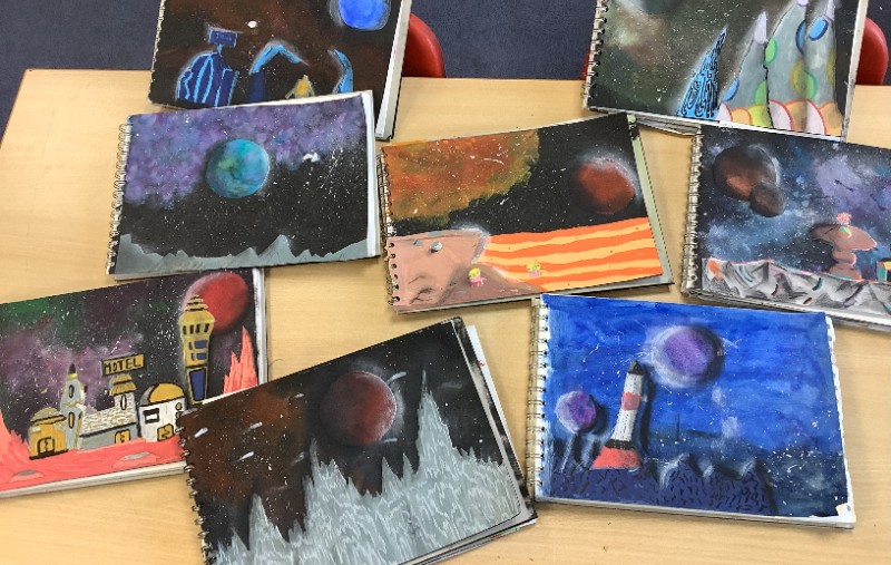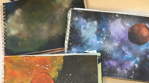 What a busy week we have had. Our Art is really coming together; we have completed our nebula and star clusters, our planet(s) and our foreground. Next week, we will put all elements together and then create a light and dark effect by using chalk and charcoal.