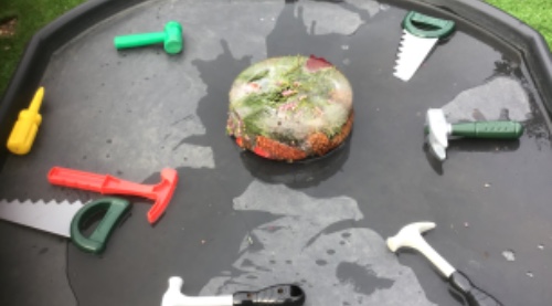 The children have been busy exploring ice both indoors and out and have used tools to break it to investigate what was frozen inside. They have been using words such as frozen, melting and cold.