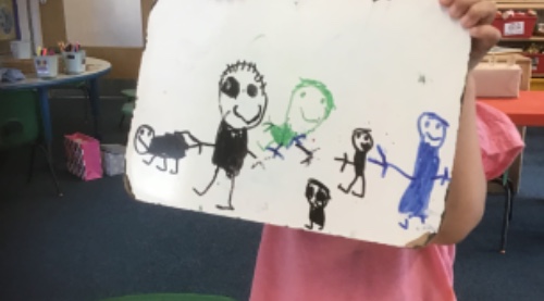 The children have been identifying different features of their faces including nose, mouth, ears, eyes and hair. They have used paint to make self portraits and have enjoyed using the whiteboards to draw on, creating pictures of themselves and their families.