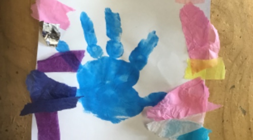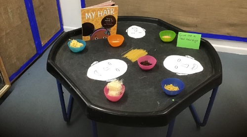 We have made colourful framed handprint pictures and the children have been using different materials on the tuft tray to create different hair styles.