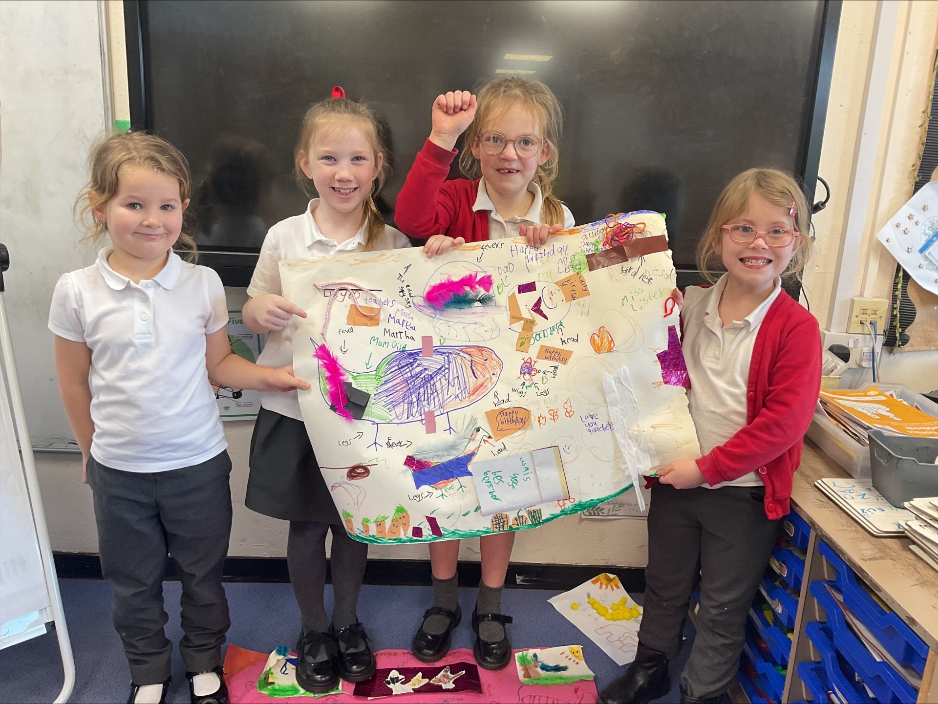 In English this week, we have been learning about techniques and devices in poetry, and have written an acrostic poem about clouds. Reception are putting into practice their fast developing skills that they have learnt in phonics, to write labels, captions and sentences, during their English learning.