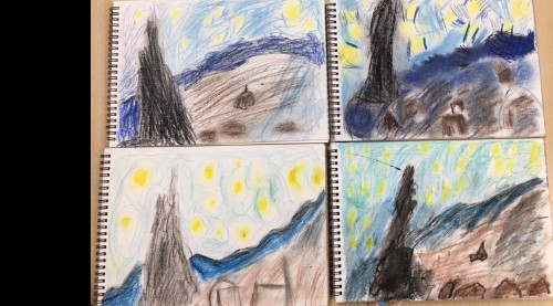 We've been getting creative this week, by studying some of the paintings by Vincent Van Gogh. We looked in detail, at the painting 'Starry Night' and used oil pastels to recreate the painting. We tried to imitate the type of brush strokes that he used, and then practiced our skills of blending the colours with our fingers. We hope you like the results.